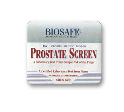 The BIOSAFE Prostate Screen is a laboratory blood test that measures a chemical substance produced by the prostate gland called Prostate Specific Antigen (PSA). Small amounts of this substance can be measured in the bloodstream by the Prostate Screen. The BIOSAFE Prostate Screen provides you with an accurate, convenient, and inexpensive way to discover your own PSA level. Using the special lancet (included in the Kit), a couple of drops of blood are taken from a nick of a finger and deposited onto a special collection card. The card is then sent to BIOSAFE Laboratories for analysis. BIOSAFE tests your blood sample to see how much PSA is present and then mails the results back to you in an easy-to-read report. Call them at 1-888-700-TEST or you can purchase it online from numerous retailers for around $40.
