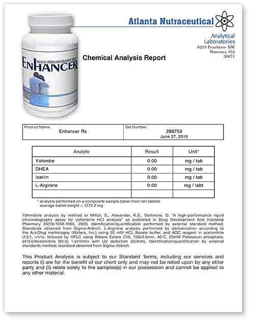 The lab results fell far short of what they claim on their product label. The level of L-Arginine was solid, with almost 300mg per serving, but the rest of the results were a joke. The score for yohimbe and Icariin indicate that this pill will never do what they claim on their bogus website.