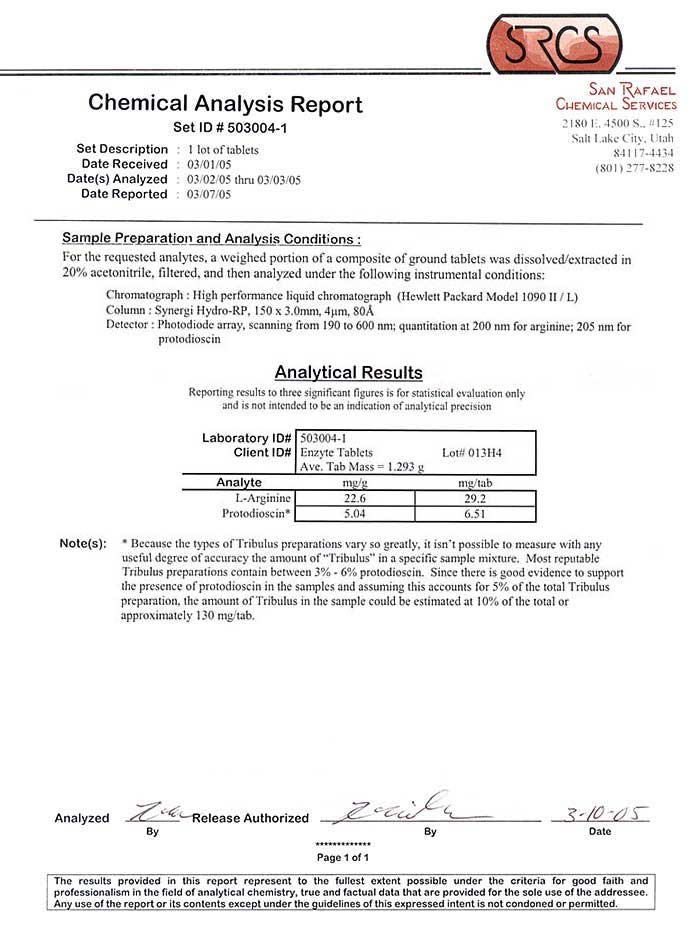 The actual Enzyte tablets are not much different than numerous other products sold in health food stores across the country for about $30 a bottle. There have been several different Enzyte formulas, yet the advertising claims did not reflect the changes to the formula. Initially Enzyte contained yohimbe. If you look at the laboratory report from IBC Labs which tested for yohimbine you will see the tablets had a good amount of the alkaloid yohimbine in them. They also have a high amount of tribulis terrestris as well. The current formula, which is found in most stores no longer contains yohimbine.Lab tests reveal the level of L-Arginine in all Enzyte formulas I had tested were extremely low and therefore would not offer a man much benefit at all.