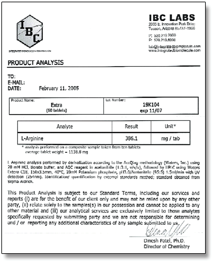 I only had Extra tested for L-Arginine. The label claims 750 mg of L-Aginine per serving and the tests show that it has about half of that with 386 mg per serving. It is off by about 50%. But what is really interesting is if you compare these levels with some of the others in the Scam Section. Procylon lab test which showed it contains less than 6 mg of L-Arginine or Maxoderm which was 0 mg L-Arginine or Magna Rx which had about 84 mg, compared to those pills Extra seems like a champion. It is not, it is the best of the worst.