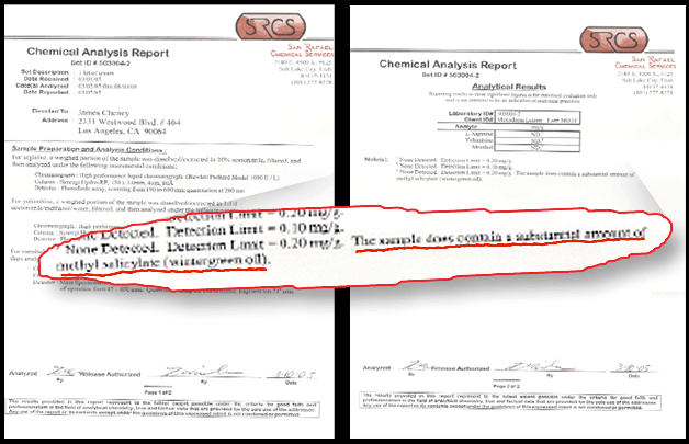 A SECOND TEST SHOWS NOT ONLY DOES MAXODERM NOT CONTAIN ANY L-ARGININE, NO YOHIMBINE, BUT THAT IT IS SECRETLY LACED WITH A SUBSTANTIAL AMOUNT OF METHYL SALICYLATE, THE KEY INGREDIENT IN THE PAIN RELIEVER BEN GAY - AND SOMETHING THAT IS NOT LISTED ON THE MAXODERM LABEL!!!