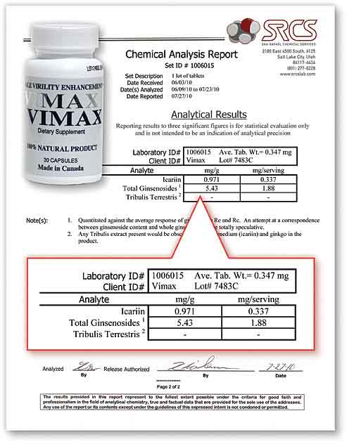 Ginsenosides) is less than 2mg per serving! There is more ginseng in the drinks they sell at 7-11 for a buck! Ginseng is an inexpensive ingredient and really isn’t that vital to a sex formula unless it’s a strong extract of Korean Red ginseng – not this cheap stuff found in Vimax. Like we always say – LAB REPORTS DON’T LIE! This product is 100% worthless. |