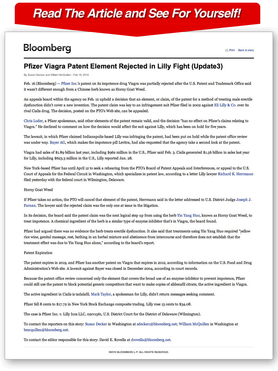 | I don’t use Viagra, Cilias, or Levitra! They are synthetic drugs with dangerous and unpleasant side effects that you don’t hear about too much in the news. Besides, as I have been saying for years top herbal product works. This story on Pfizer’s attempt to get a patent on Viagra was denied because of the herb Horny Goat Weed(HGW)!! If you have every tried HGW chances are you tried a cheap version. There are many cheap powdered version on the market. Unfortunately, most pill companies use the cheap stuff. But the real stuff, the real high grade HGW, especially when combined with other top ingredients works great. Pfizer knows this. The trademark office basically said- “Look Viagra, we can’t give you a patent on everything you want on Viagra because you are just copying HGW. You can’t patent something that already exists in nature. Read the article below from Bloomberg news. So now do you believe me when I say Herbal Pills, if they are made correctly, are great! Don’t waste your money on the chemical drugs! |