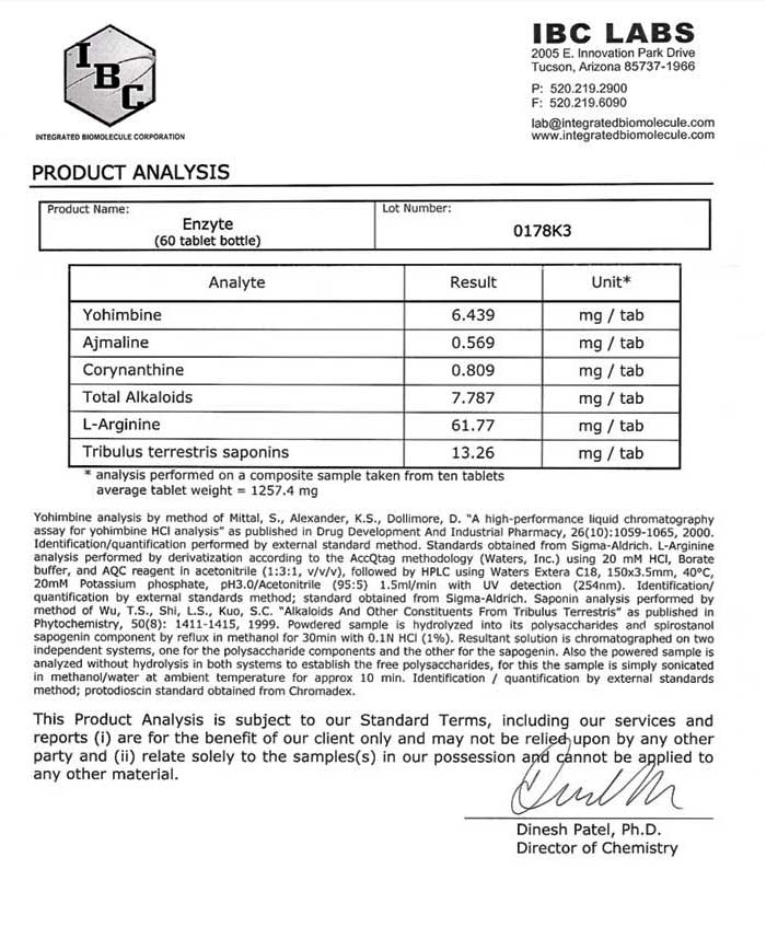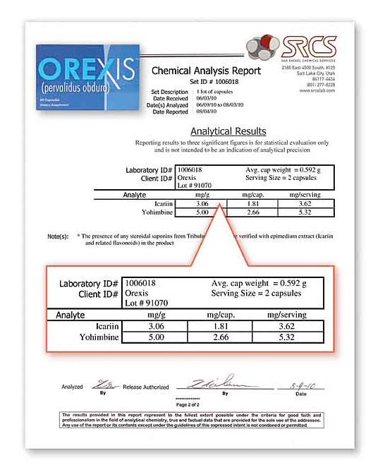 This should not come as much of a shock. The lab reports reveals that this powdered formula that is supposed to create a miracle, is basically worthless powder. Probably rice powder. This is the definition of a scam.This test examined the level of Yohimbine and Icariin (the active component of Horny Goat Weed.) The ND means that None Detected. And this sophisticated test can detect levels as low as 0.10 mg. So there is zero yohimbine and zero horny goat weed in these pills. The label claims there is 100 mg of each ingredient. |