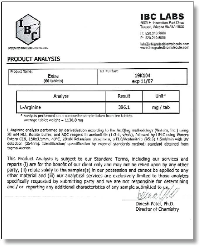 | I only had Extra tested for L-Arginine. The label claims 750 mg of L-Aginine per serving and the tests show that it has about half of that with 386 mg per serving. It is off by about 50%. But what is really interesting is if you compare these levels with some of the others in the Scam Section. Procylon lab test which showed it contains less than 6 mg of L-Arginine or Maxoderm which was 0 mg L-Arginine or Magna Rx which had about 84 mg, compared to those pills Extra seems like a champion. It is not, it is the best of the worst. |