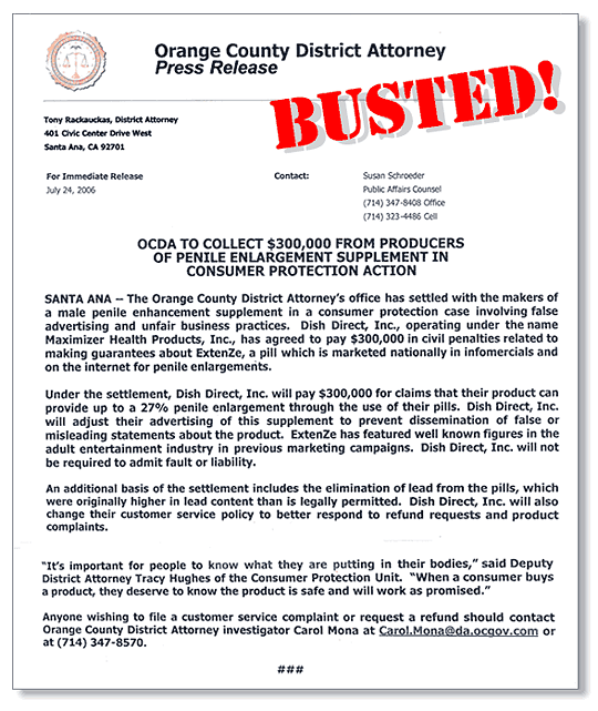 1. The makers of Extenze we fined $300,000 in July of 2006 by the Orange County District Attorney office for false advertisinf claims. Specifically they were nt longer allowed to make the claim their product makes a mans pensi 27% bigger, since there was no scientific basis for this false claim. Not only were their claims incredibally false - but the pills also contains huge amounts of lead!