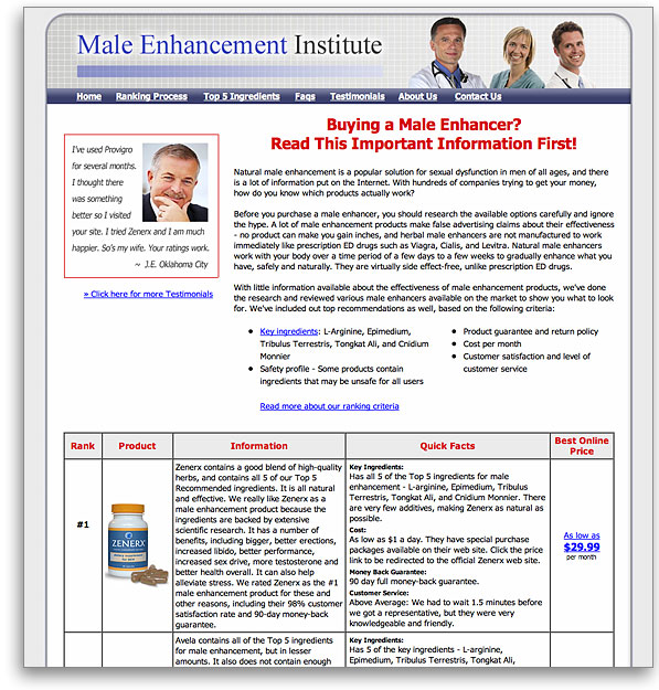 This fake rating site has been around for years calling itself the Male Enhancement Institute. This website should be in the Scam Hall of Fame. If there isn’t a Scam Hall of Fame then they should start one and make these guys the first inductee! This fake site which has been misleading and deceiving men since 200? is just a front for the product Zenerx from Everest Nutrition. It is so irritating to see a photo of three doctors at the top of their website, which are there to give the consumer the impression that doctors are involved. All three of the photos are fakes. Anyone can get them from websites like iphoto.com for less than $5.00. One of the funniest things about this site is how they go out of their way to say yohimbe is not a good ingredient to have in a men’s sexual enhancer. They cite something from the FDA that says it could be dangerous. Well, that’s a bunch of bull. Yohimbe is the most studied natural supplement for getting you hard. Sure, with some real old guy it could causes a problem because it is strong and works so well. But this is all phony-baloney: they don’t know what they are talking about. For the Zenerx formula is a joke. Ask anyone in the sex pill industry who knows anything about formulating good pills. And they will all tell you that yohimbe is an absolute must. This is but a bogus site that also gives out stupid information!