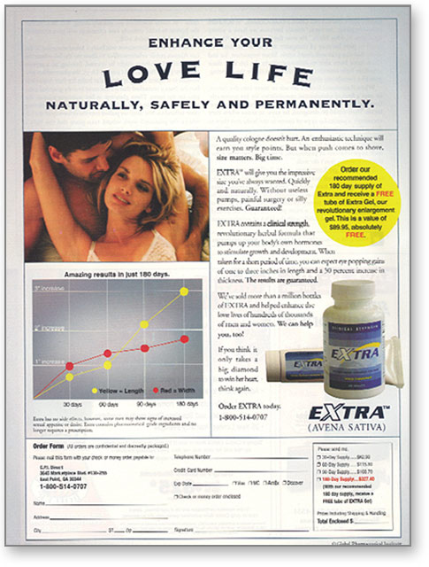 The company behind Extra is called Global Pharmaceutical Institute. This is a big sounding name for a what is simply a big scam. Maybe they should call themself Global Scam Institute. Look at this fraudulent ad. The chart is 100% fraud. They have it in there to trick you to steal your money, figuring most people are honest and will think “hey it looks like a scientific chart, it must be real.” It is not. If it is, all they have to do is take me up on my Million Dollar Challenge and they will pick up a fast easy million. They don’t even have a website? If they are so big and so legitimate - why don’t they have a website? These days it seems like even shoeshine boys have websites, why not the mega international conglomerate that calls themselves Global Pharmaceutical Institute? They also claim permanent results. It is all one big lie. No pill you take can claim permanent results. This scam won’t make anything bigger except their wallets. Don’t get suckered by this scam. |