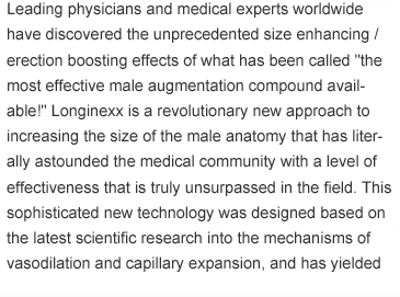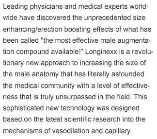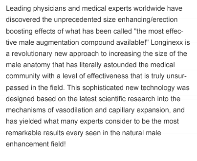 Leading physicians and medical experts worldwide have discovered the unprecedented size enhancing/erection boosting effects of what has been called "the most effective male augmentation compound available!" Longinexx is a revolutionary new approach to increasing the size of the male anatomy that has literally astounded the medical community with a level of effectiveness that is truly unsurpassed in the field. This sophisticated new technology was designed based on the latest scientific research into the mechanisms of vasodilation and capillary expansion, and has yielded what many experts consider to be the most remarkable results every seen in the natural male enhancement field! Leading physicians and medical experts worldwide have discovered the unprecedented size enhancing/erection boosting effects of what has been called "the most effective male augmentation compound available!" Longinexx is a revolutionary new approach to increasing the size of the male anatomy that has literally astounded the medical community with a level of effectiveness that is truly unsurpassed in the field.