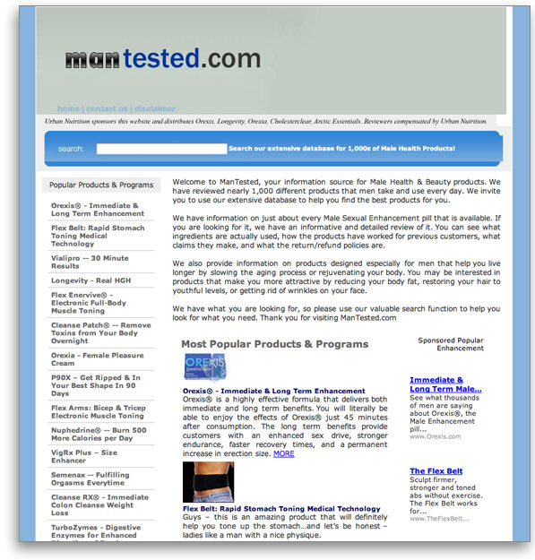These two websites were set up to sell Orexis. They even say on the front of both bogus websites that each website is sponsored by Urban Nutrition, the distributors of Orexis! So how can they be unbiased or truthful when the product they sell they rate number one? At least they tell you right up front who they are. They must think most guys won’t see this, and if the authorities come after them for running a scam, they can say, “Hey, we tell people right up front we own the products we rated #1." They can say whatever they want. The bottom line is, this site is just another male enhancement scam. If you see the lab report on Orexis you’ll understand what a joke it is. Orexis is not sold in stores and they never advertise in any magazines or anywhere else. Their entire business is built on this fake website. Don’t let them trick you out of your money!