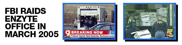 50 AGENTS FROM THE FBI, U.S. POSTAL SERVICE, FDA AND VARIOUS POLICE AGENCIES CONDUCT A MASSIVE THREE LOCATION RAID OF THE ENZYTE OFFICES, BANK ACCOUNTS ARE FROZEN AS SEALED SEARCH WARRANT, AUTHORIZED BY A FEDERAL JUDGE, SIGNALS FUTURE INDICTMENTS SAY EXPERTS. |