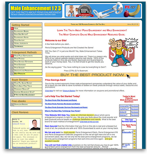 One of the more sophisticated scams on the Internet today. Their motto is “Penis Enlargement Myths Shattered. Truth Revealed.” Well, the one thing you are sure not to get on the bogus site is the TRUTH. It is just another of those massive fake information sites that we are delighted to expose. This crooked site is just a front for Vimax. If you want to see what a complete scam Vimax is, all you have to do is look at the lab report we have done on it. There aren’t enough ingredients in these pills to give a fruit fly an erection! Like all of the top scams, it is very clever in the way they trick you. Our team of investigators and private detectives has gotten to the bottom of this scam and believed these scamsters will soon be shut down. Here are some of the obvious indications they are a scam out to trick you and steal your money with their lies: